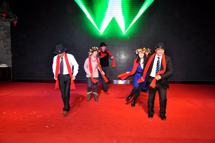 壓軸大戲,老板與總監(jiān)一起上臺(tái)跳大秧歌,伴隨著音樂到臺(tái)下給小伙伴們派發(fā)糖果和糕點(diǎn),掀起了晚宴的高潮。一片歡樂祥和的氣氛結(jié)束了此次的晚會(huì)。